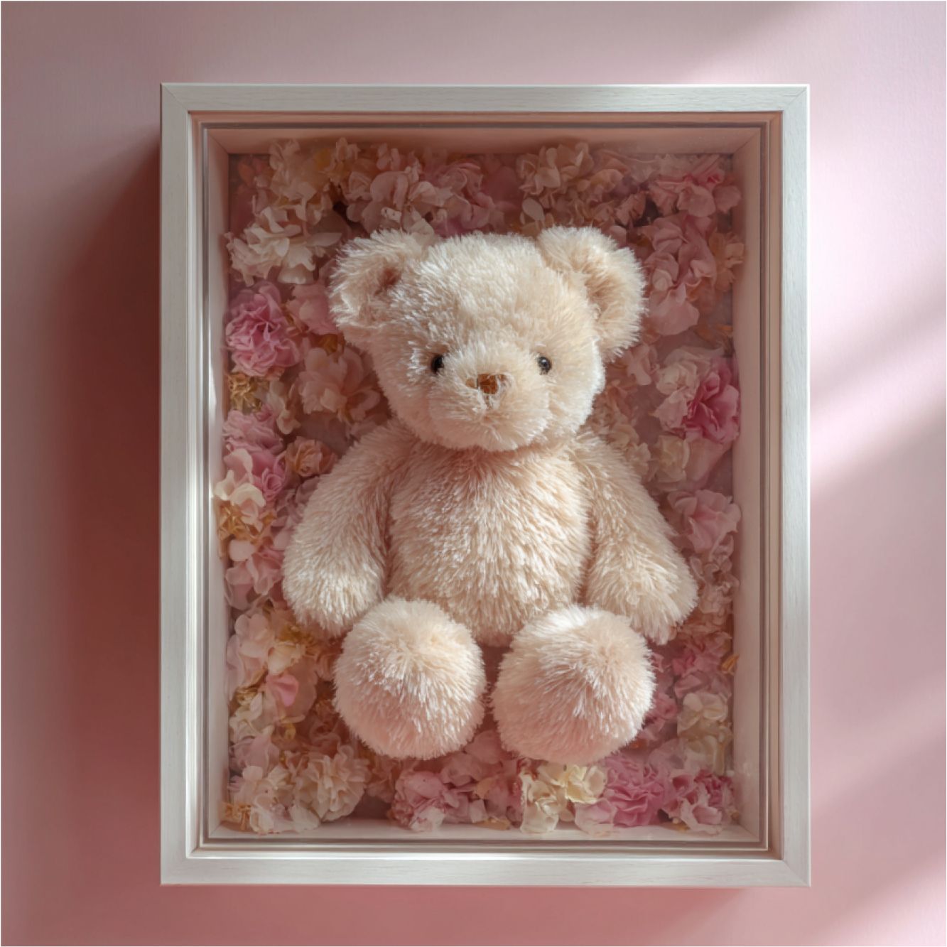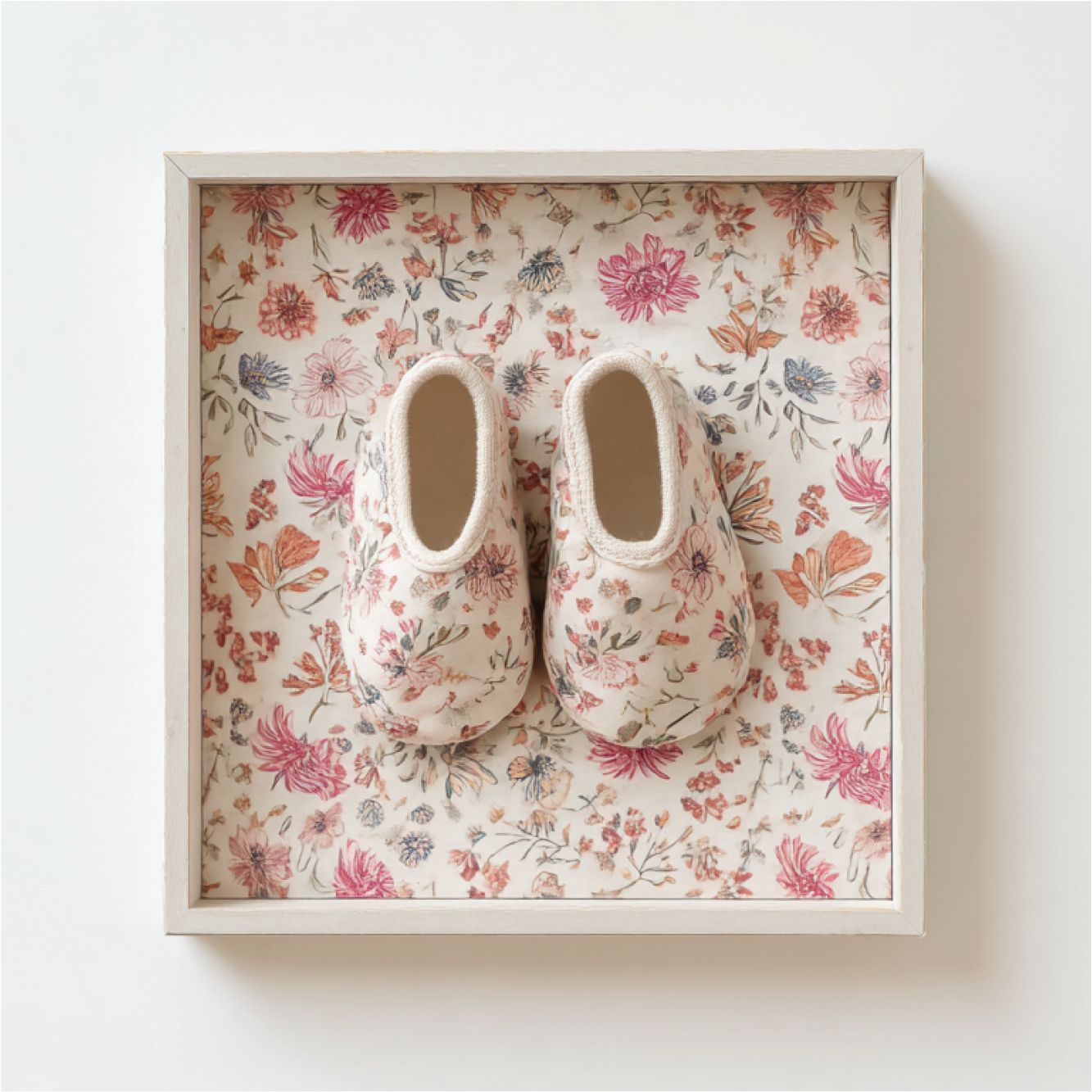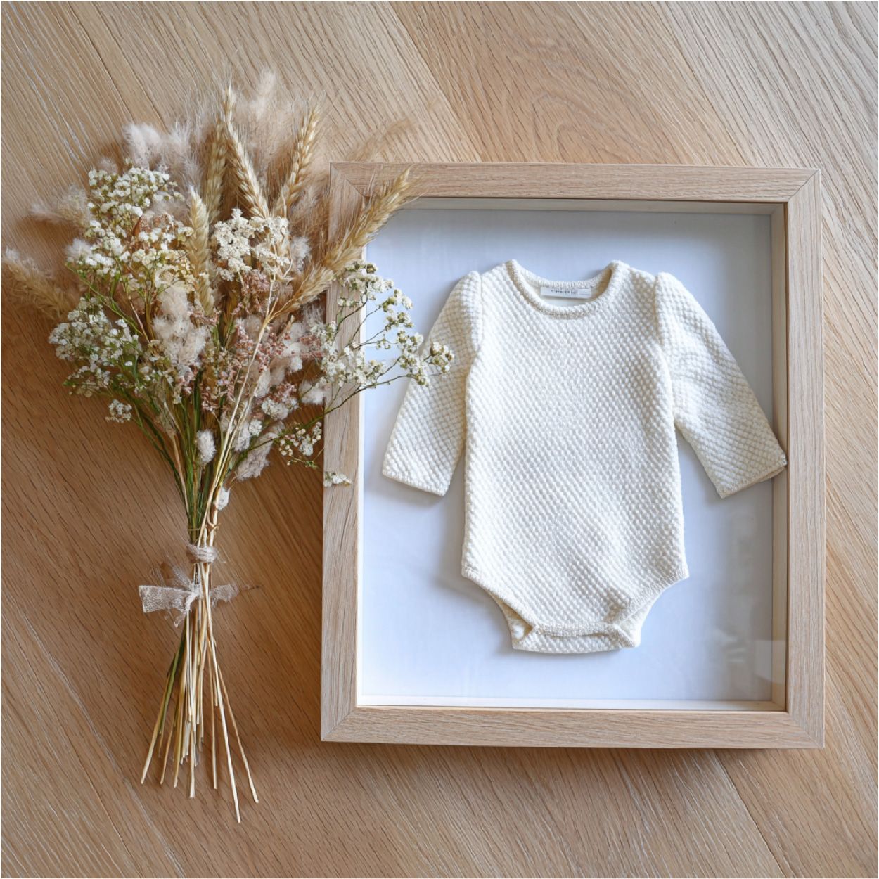 Les possibilités sont très larges : photo de bébé, petit vêtement ou chausson, bonnet, mèche de cheveux, empreinte de main ou de pied, premier doudou plat, tétine, faire-part ou illustration. Certains clients y intègrent même un petit montage de plusieurs souvenirs, pour recréer une atmosphère chargée d’émotion. Le montage avec plusieurs souvenirs peut se réaliser uniquement en atelier.